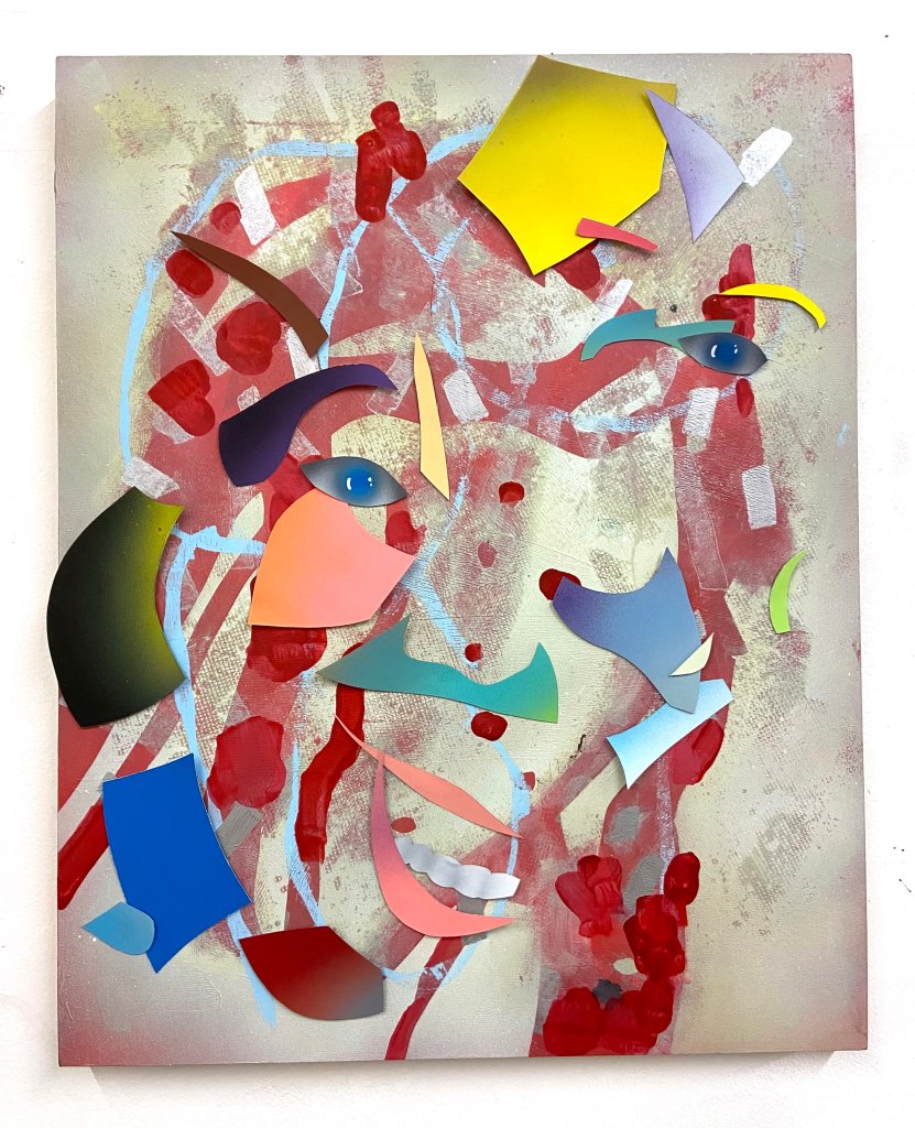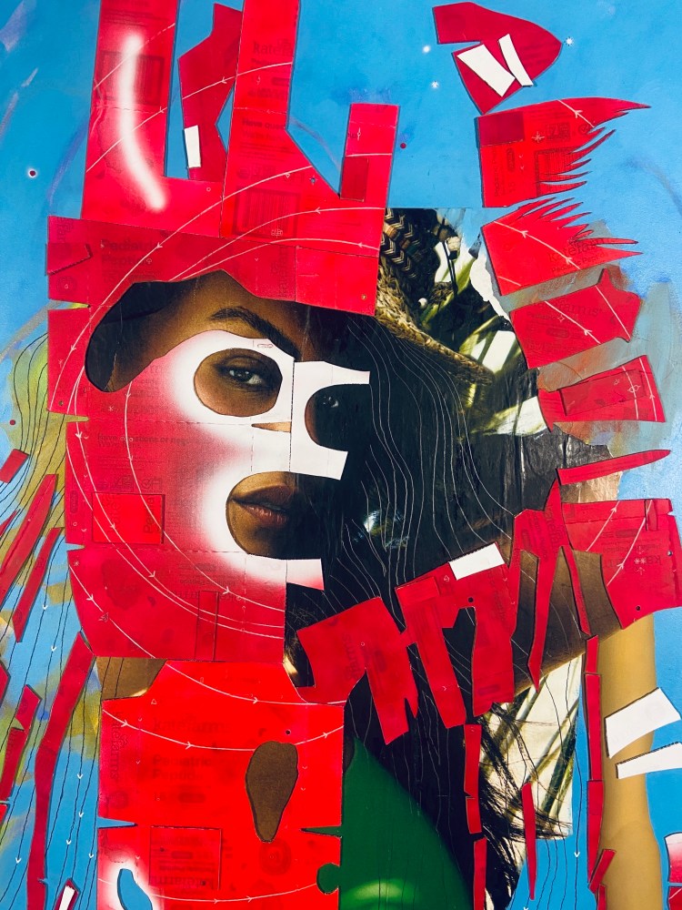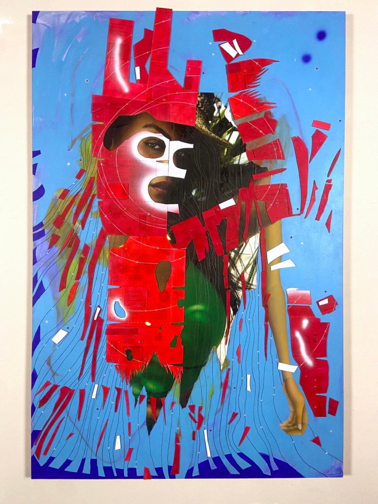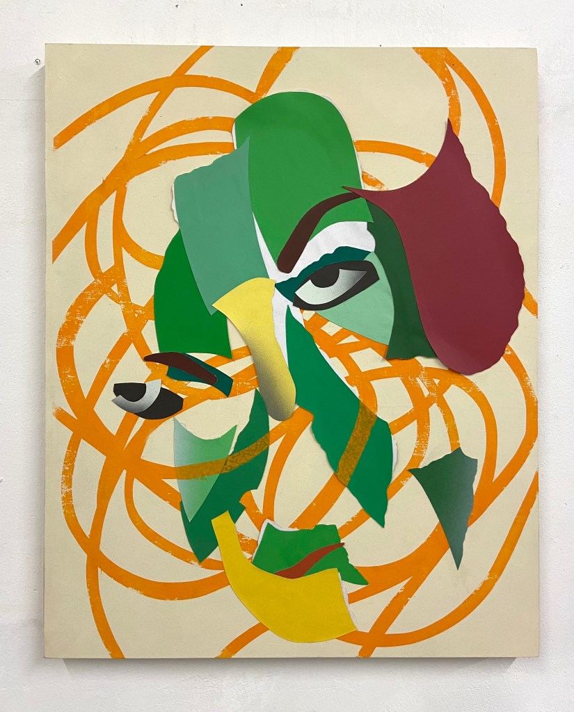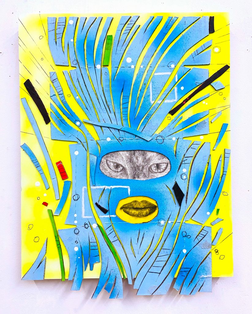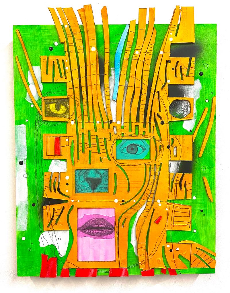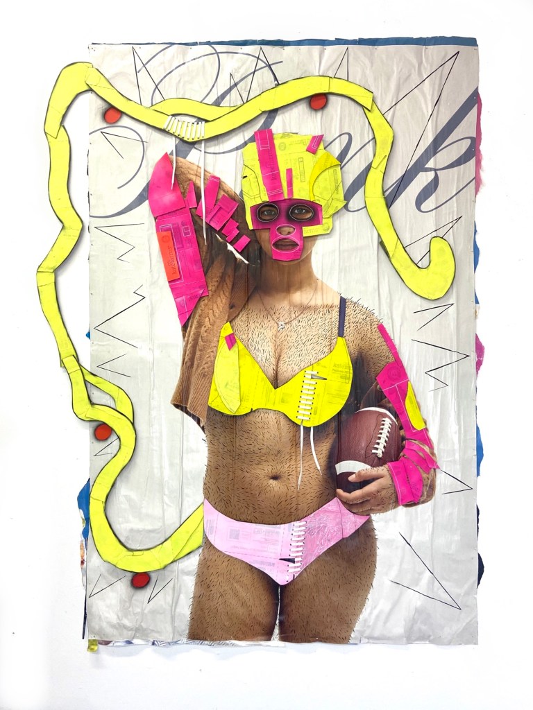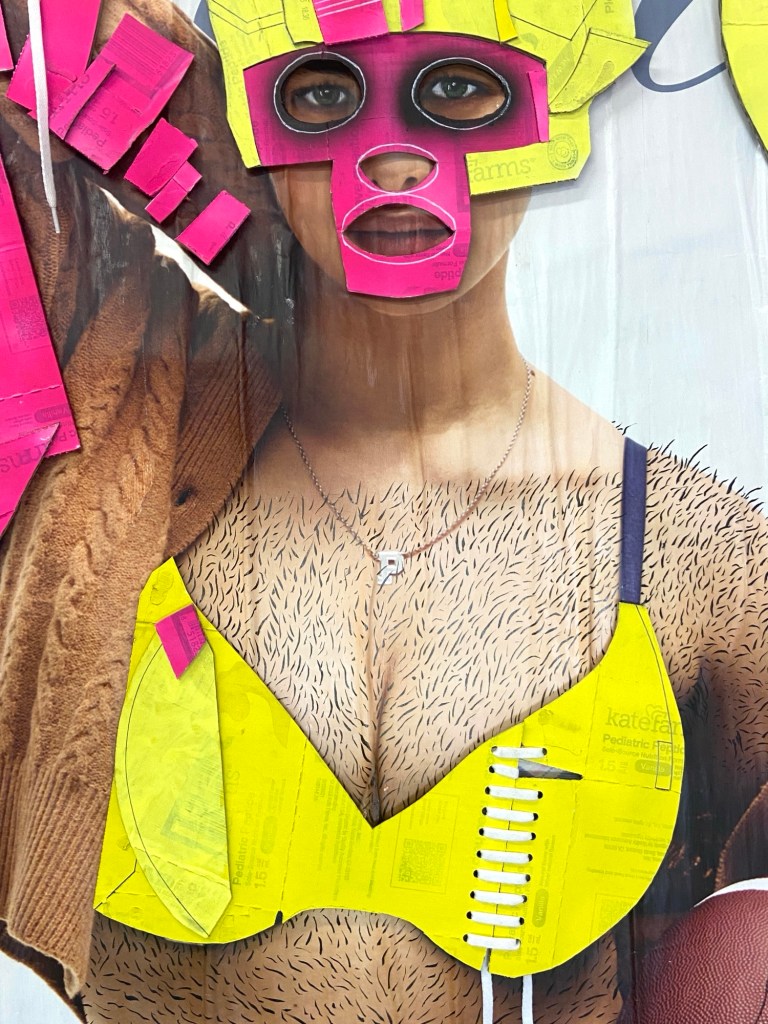 Reclaimed street poster, acrylic paint, ink, colored pencil, shoelaces, recycled cardboard nutrition boxes, paint swatches,