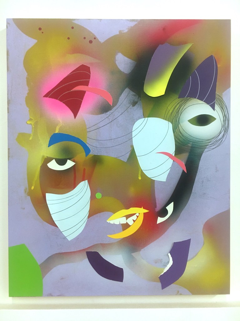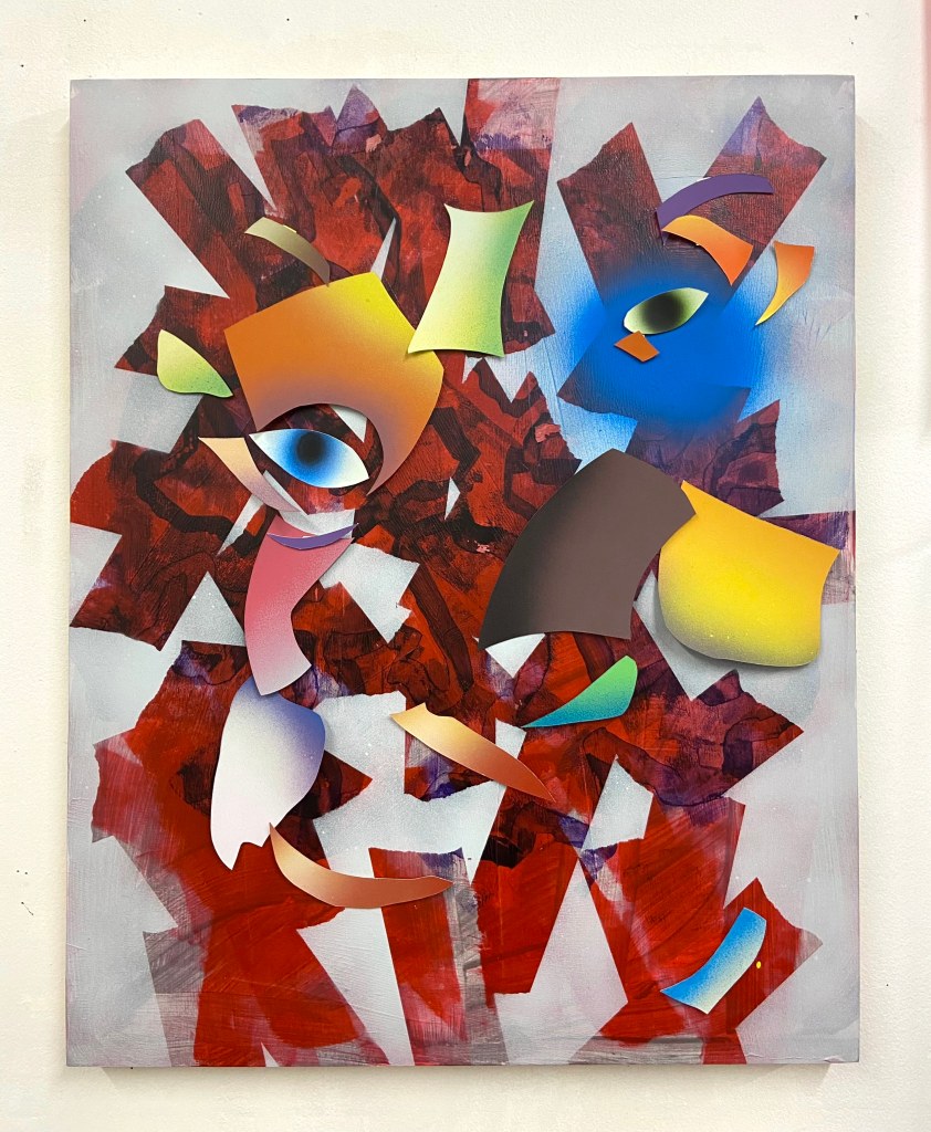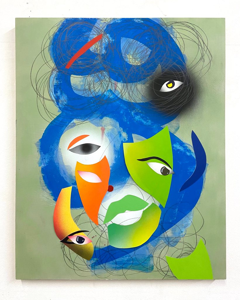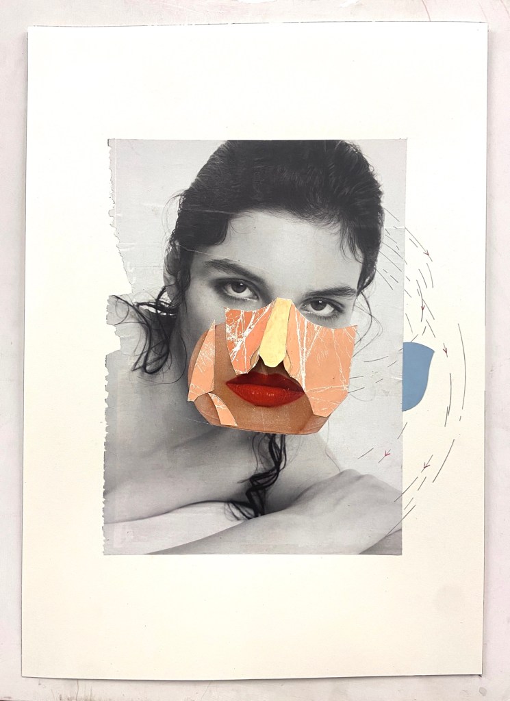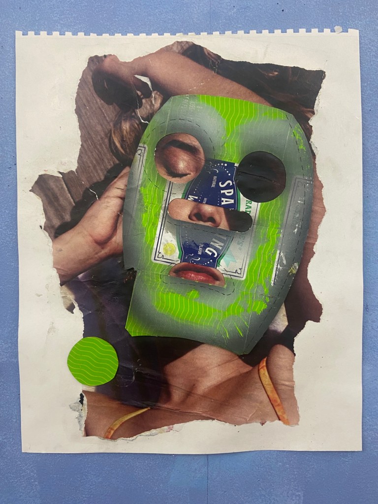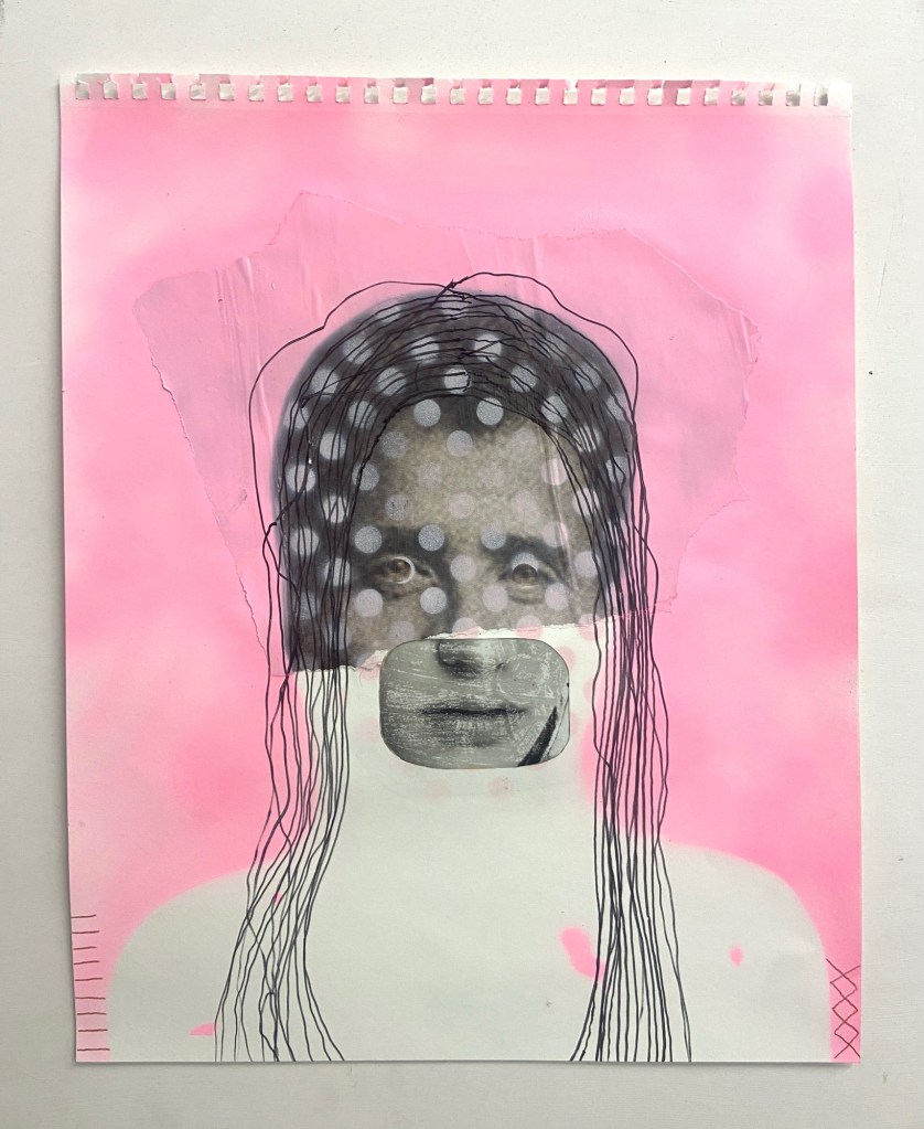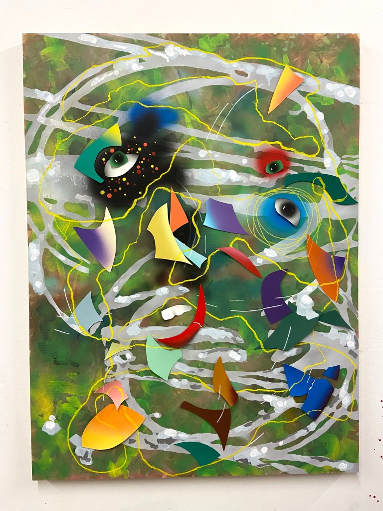 Reclaimed street poster, acrylic paint, ink, colored pencil, shoelaces, recycled cardboard nutrition boxes, paint swatches,