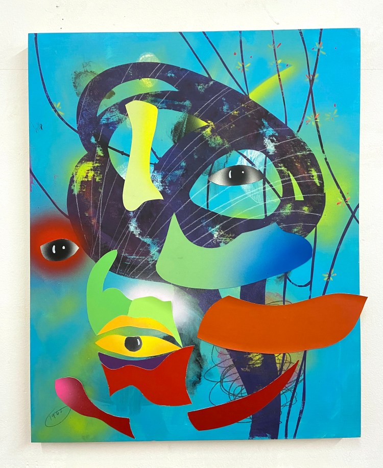 Reclaimed street poster, acrylic, pencil, colored pencil, recycled cardboard nutrition boxes