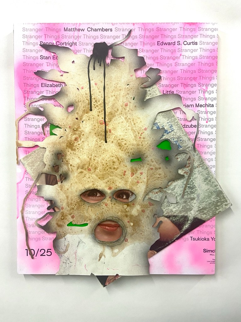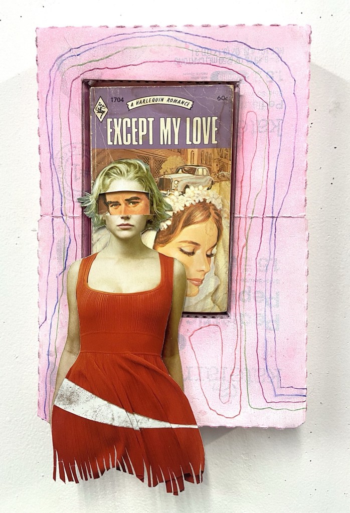 Acrylic paint, colored pencil, Harlequin romance paperback book, magazine page, sole-source nutrition cardboard box