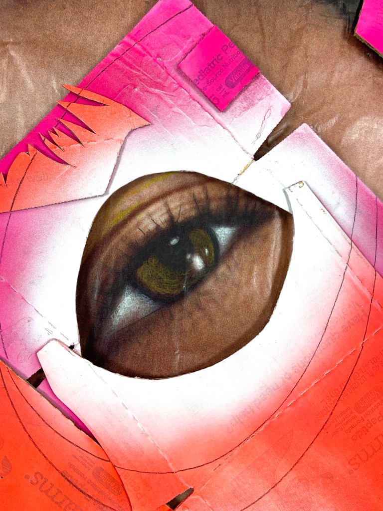 colored pencil, recycled cardboard nutrition boxes on wood panel