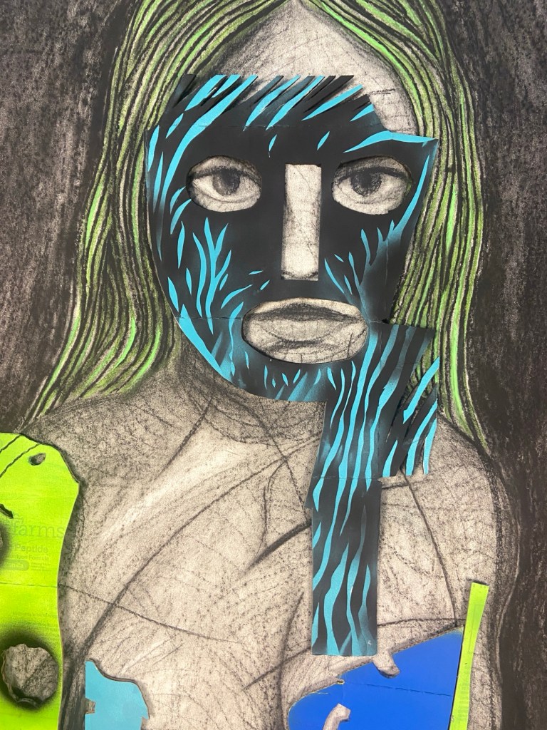 Reclaimed street posters, acrylic paint, colored pencil, recycled cardboard nutrition boxes,