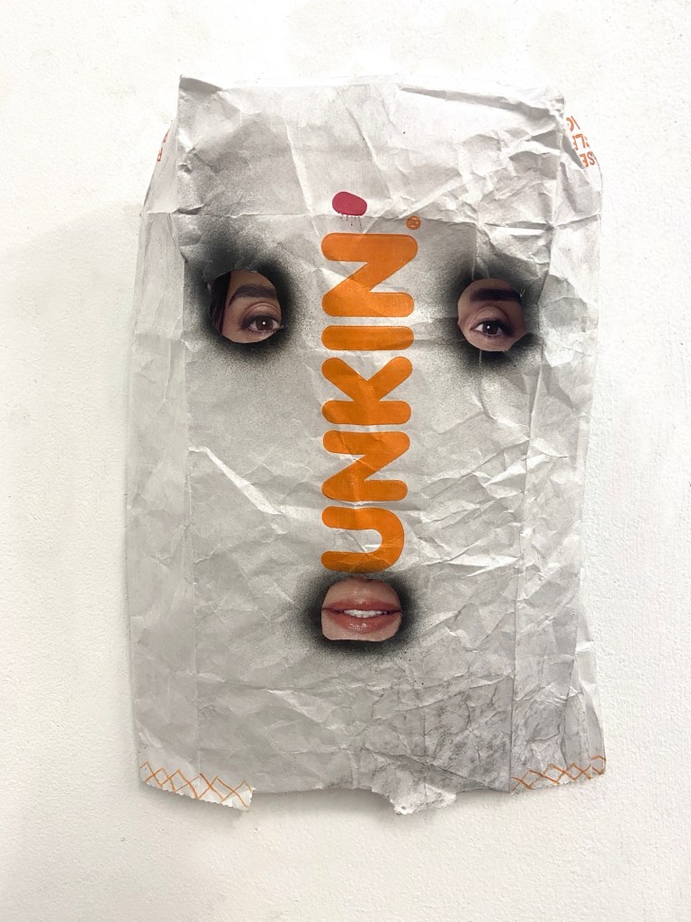 Recycled Dunkin’ Donuts paper bag, magazine page, acid-free card stock, acrylic paint, graphite,