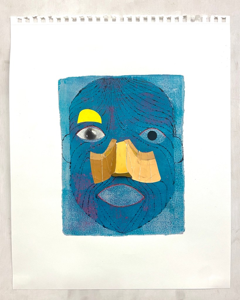 Acrylic paint monoprint with ink, colored pencil, and attached paint swatches on paper