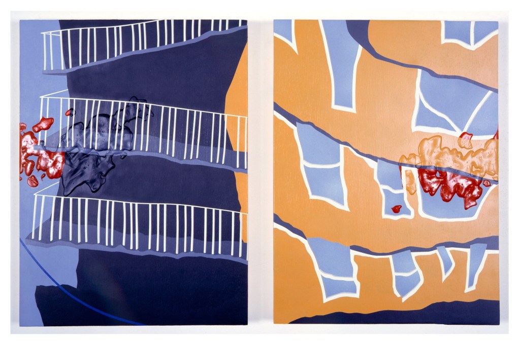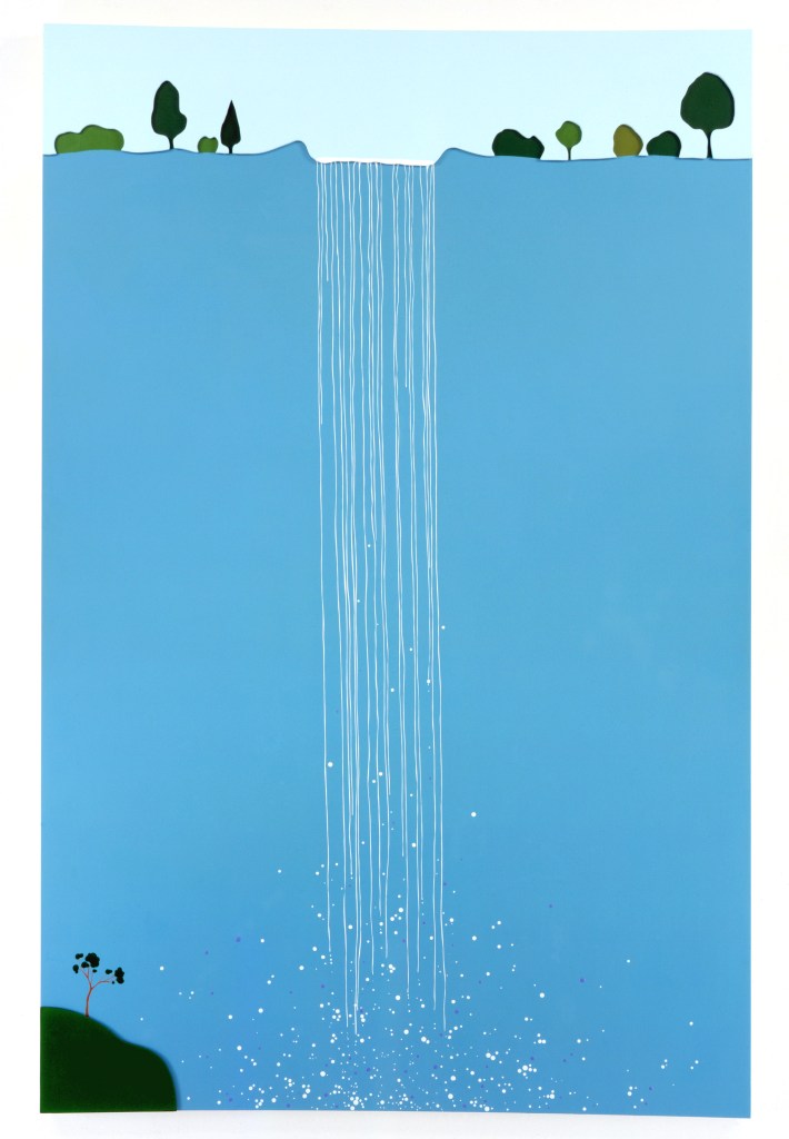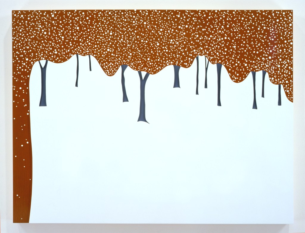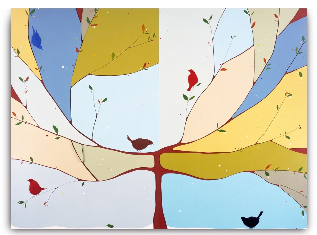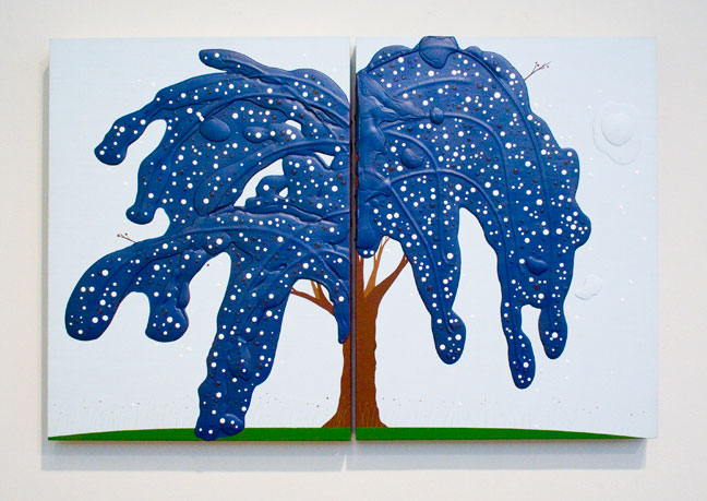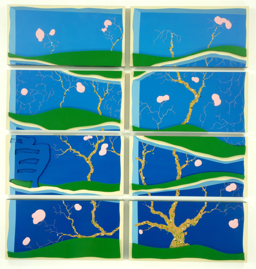 acrylic paint on eight wood panels with wood attachments, glass micro-beads