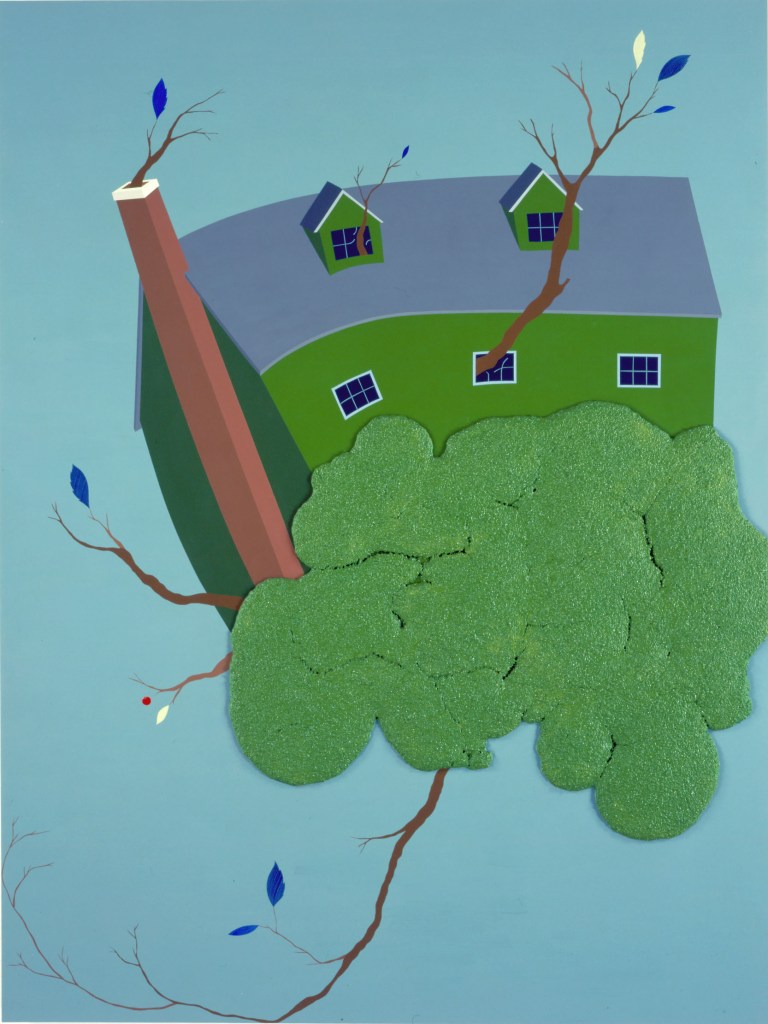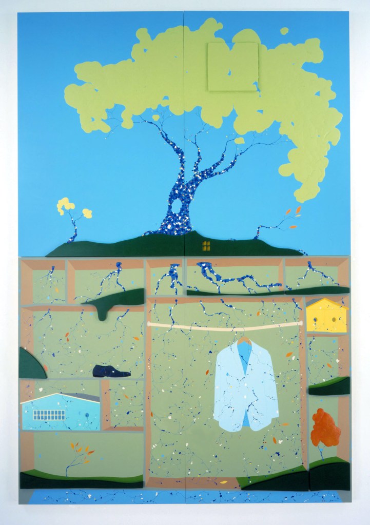 acrylic paint, glass micro-beads on wood panel with wood attachments