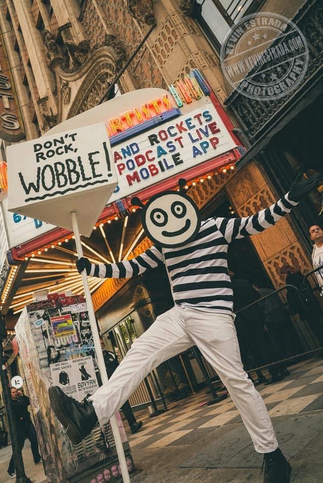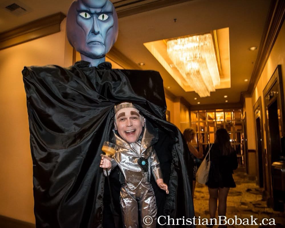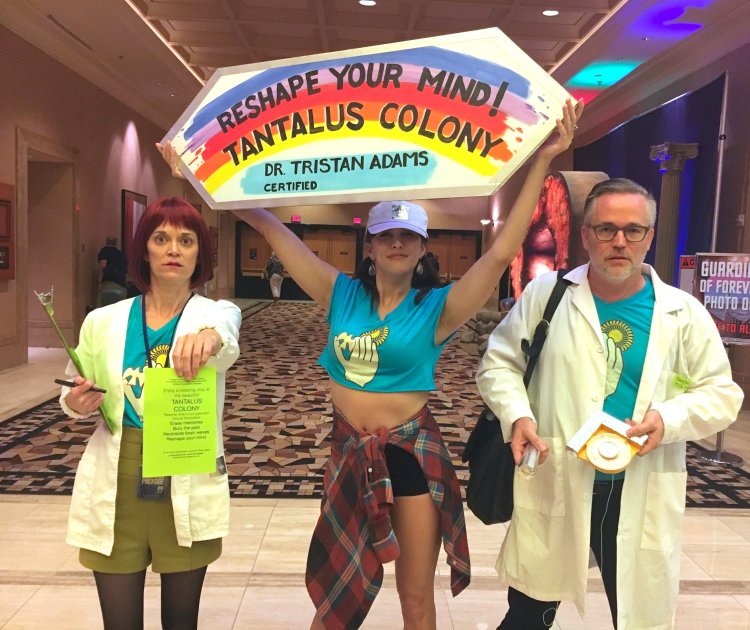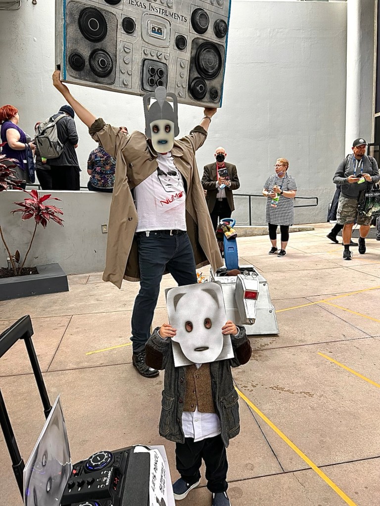 The props included an assemblage stereo sculpture, a Cyberman mask, and a hand-painted T-shirt