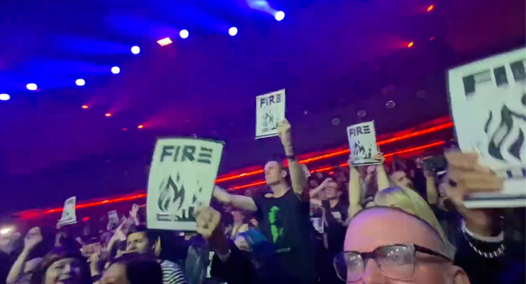 The covert fan action involved distributing approximately 200 promotional linocuts, which were raised during the band’s performance of Join in the Chant, surprising both the audience and the band.