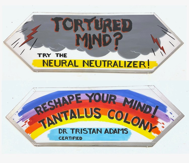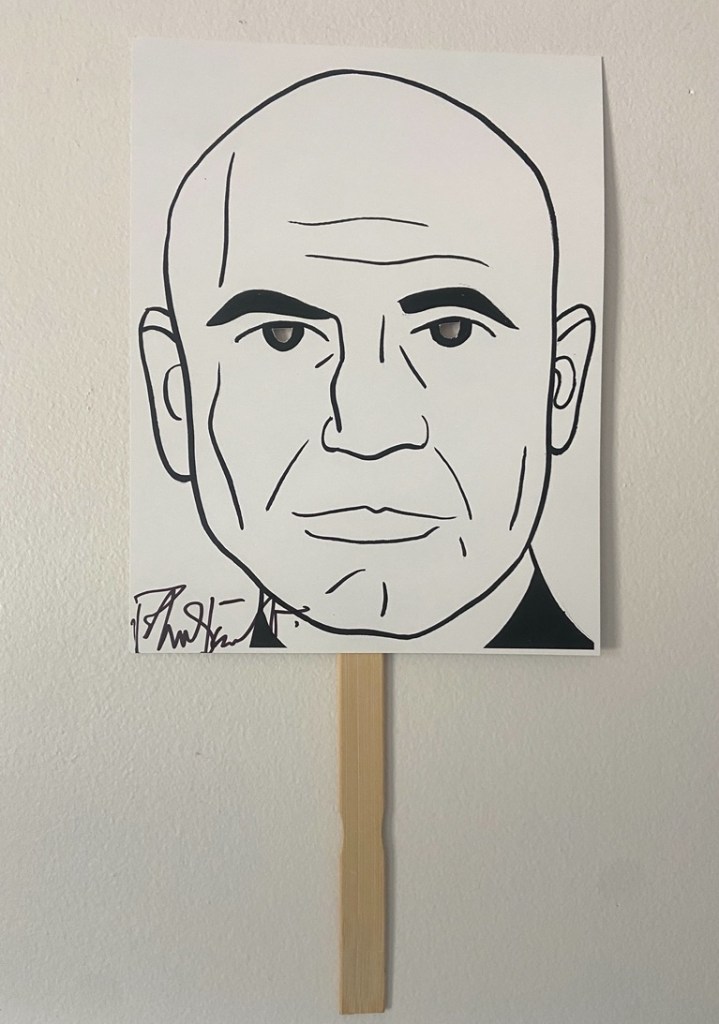 The three-sided sign, mask, and a paper flyer, were utilized in a performance outside the venue.